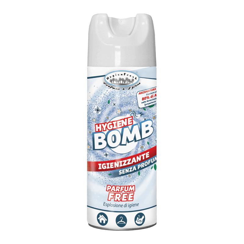 Hygiene Bomb Igienizzante Senza profumo – bekvapis purškiklis, dezinfekuojantis medžiagas ir paviršius. Produkto sudėtyje yra 80% alkoholio ir dėka aukštos alkoholio koncentracijos paviršiai akimirksniu dezinfekuojami. Nupurškus kietus paviršius, nereikia nuplauti. Gali būti naudojamas įvarios sudėties medžiagoms dezinfekuoti. Į audinius įsiskverbia giliai, juos dezinfekuodamas, greitai išdžiūsta. Purkšti 30-40 cm atstumu, nenaudoti TV ekranų ir kompiuterių monitorių dezinfekavimui.
